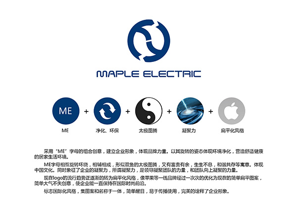 MAPLEELECTAIC環(huán)保科技公司LOGO設(shè)計(jì)釋義介紹,采用ME字母的組合創(chuàng)意,建立企業(yè)形象,體現(xiàn)品牌力量。以其旋轉(zhuǎn)的姿態(tài)體現(xiàn)環(huán)境凈化,營(yíng)造舒適健康的居家生活環(huán)境。